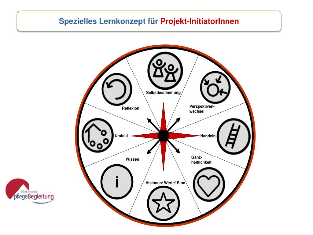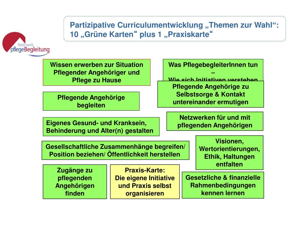 PartizipativeCurriculumentwicklung „Themen zur Wahl“: 10 „Grüne Karten“ plus 1 „Praxiskarte“ Wissen erwerben zur Situation Pflegender Angehöriger und Pflege zu Hause Was PflegebegleiterInnen tun – Wie sich Initiativen verstehen Pflegende Angehörige zu Selbstsorge & Kontakt untereinander ermutigen Pflegende Angehörige begleiten Netzwerken für und mit pflegenden Angehörigen Eigenes Gesund- und Kranksein, Behinderung und Alter(n) gestalten Visionen, Wertorientierungen,Ethik, Haltungen entfalten Gesellschaftliche Zusammenhänge begreifen/ Position beziehen/ Öffentlichkeit herstellen Zugänge zu pflegenden Angehörigen finden Praxis-Karte: Die eigene Initiative und Praxis selbst organisieren Gesetzliche & finanzielle Rahmenbedingungen kennen lernen