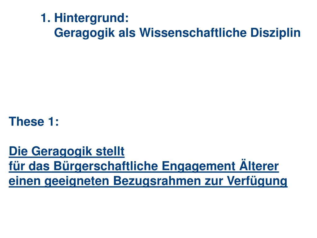 1. Hintergrund: Geragogik als Wissenschaftliche Disziplin These 1: Die Geragogik stellt für das Bürgerschaftliche Engagement Älterer einen geeigneten Bezugsrahmen zur Verfügung