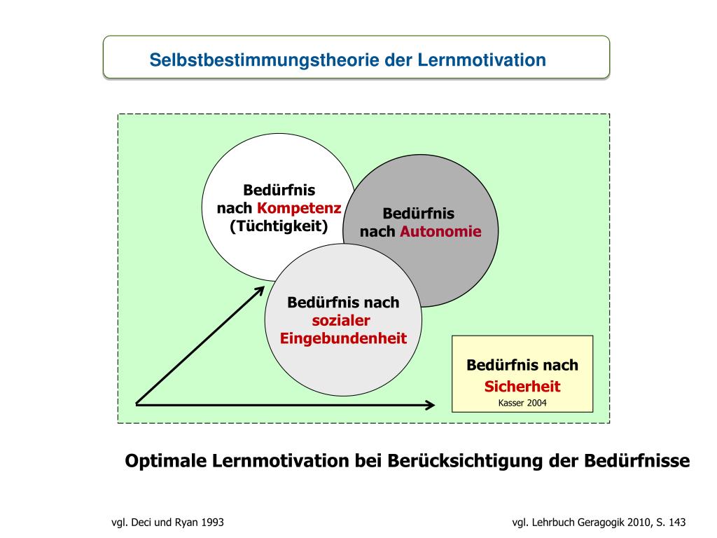 Selbstbestimmungstheorie der Lernmotivation Bedürfnisnach Kompetenz (Tüchtigkeit) Bedürfnis nach Autonomie Bedürfnis nach sozialer Eingebundenheit Bedürfnis nach Sicherheit Kasser 2004 Optimale Lernmotivation bei Berücksichtigung der Bedürfnisse vgl. Deci und Ryan 1993 vgl. Lehrbuch Geragogik 2010, S. 143