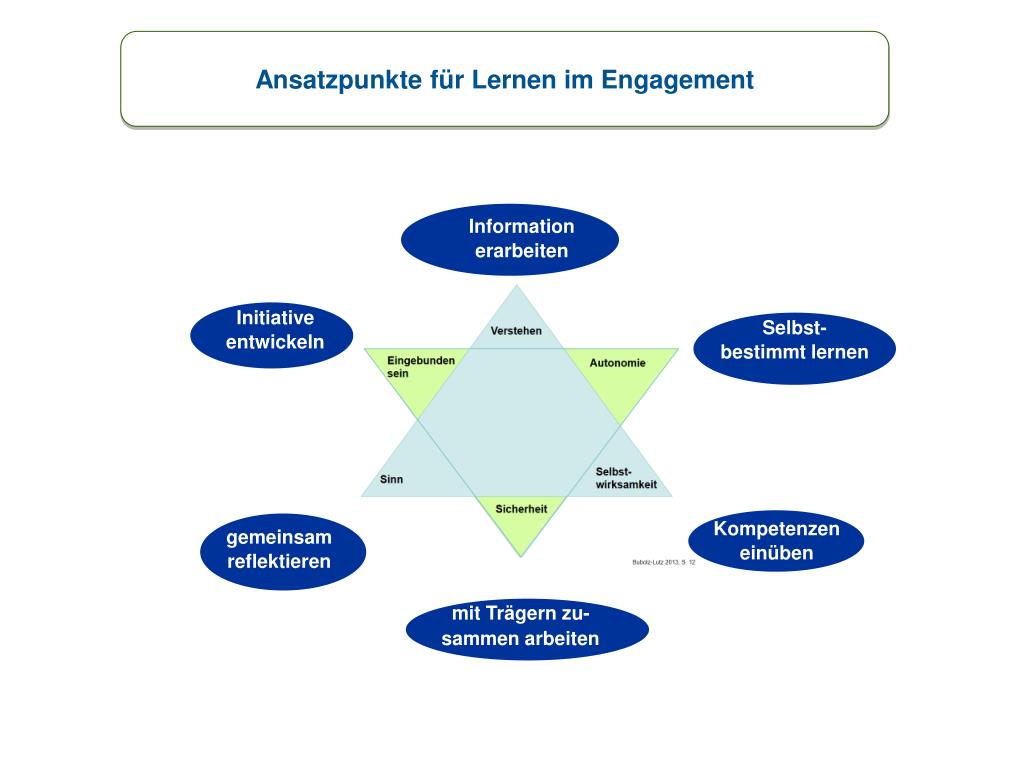 Ansatzpunkte für Lernen im Engagement Information erarbeiten Initiative entwickeln Selbst- bestimmt lernen Kompetenzen einüben gemeinsam reflektieren mit Trägern zu- sammen arbeiten
