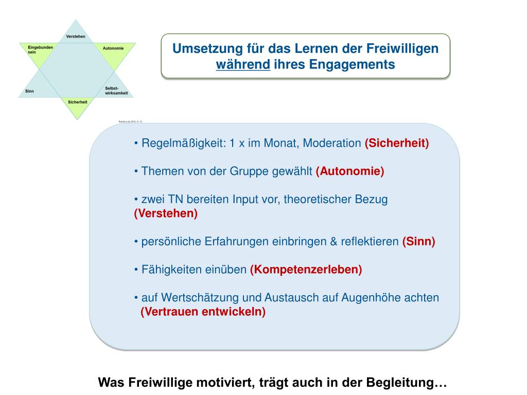 Umsetzung für das Lernen der Freiwilligen während ihres Engagements • Regelmäßigkeit: 1 x im Monat, Moderation (Sicherheit) • Themen von der Gruppe gewählt (Autonomie) • zwei TN bereiten Input vor, theoretischer Bezug (Verstehen) • persönliche Erfahrungen einbringen & reflektieren (Sinn) • Fähigkeiten einüben (Kompetenzerleben) • auf Wertschätzung und Austausch auf Augenhöhe achten • (Vertrauen entwickeln) Was Freiwillige motiviert, trägt auch in der Begleitung…
