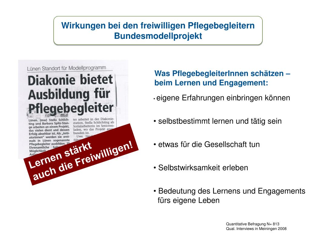 Wirkungen bei den freiwilligen Pflegebegleitern Bundesmodellprojekt Was PflegebegleiterInnen schätzen – beim Lernen und Engagement: • eigene Erfahrungen einbringen können • selbstbestimmt lernen und tätig sein • etwas für die Gesellschaft tun • Selbstwirksamkeit erleben • Bedeutung des Lernens und Engagements fürs eigene Leben Lernen stärkt auch die Freiwilligen! Quantitative Befragung N= 813 Qual. Interviews in Meiningen 2008