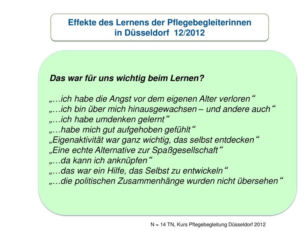 Effekte des Lernens der Pflegebegleiterinnen in Düsseldorf 12/2012 Das war für uns wichtig beim Lernen? „…ich habe die Angst vor dem eigenen Alter verloren“ „…ich bin über mich hinausgewachsen – und andere auch“ „…ich habe umdenken gelernt“ „…habe mich gut aufgehoben gefühlt“ „Eigenaktivität war ganz wichtig, das selbst entdecken“ „Eine echte Alternative zur Spaßgesellschaft“ „…da kann ich anknüpfen“ „…das war ein Hilfe, das Selbst zu entwickeln“ „…die politischen Zusammenhänge wurden nicht übersehen“ N = 14 TN, Kurs Pflegebegleitung Düsseldorf 2012