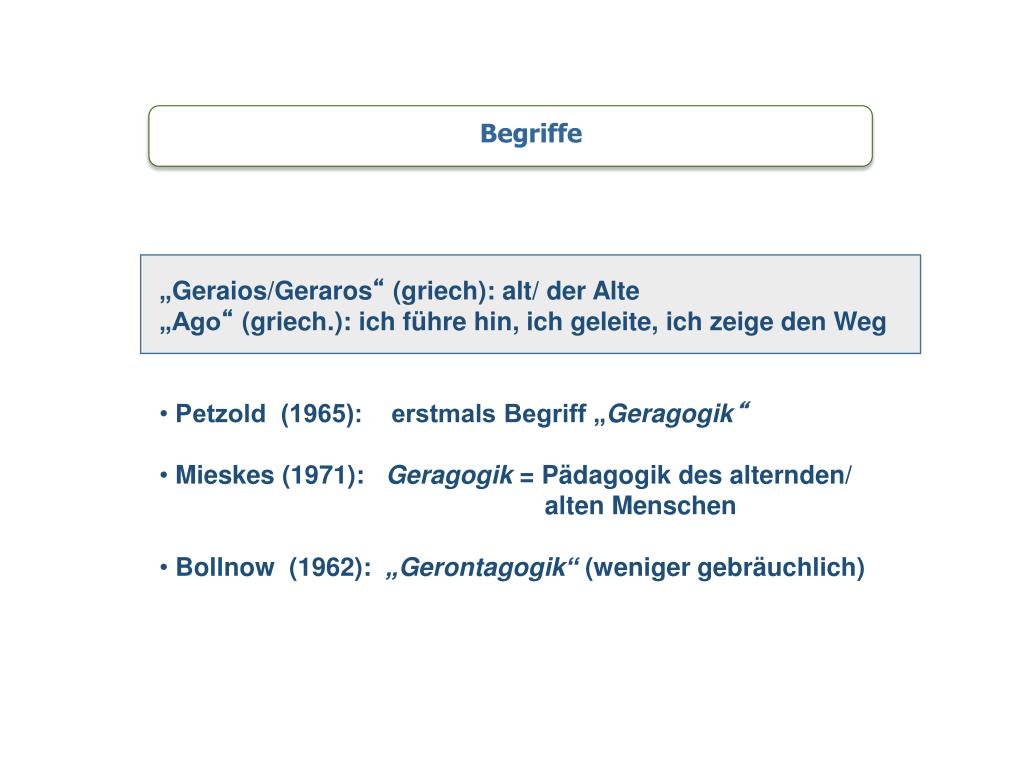 Begriffe „Geraios/Geraros“ (griech): alt/ der Alte „Ago“ (griech.): ich führe hin, ich geleite, ich zeige den Weg • Petzold (1965): erstmals Begriff „Geragogik“ • Mieskes (1971): Geragogik = Pädagogik des alternden/ alten Menschen • Bollnow (1962): „Gerontagogik“ (weniger gebräuchlich)