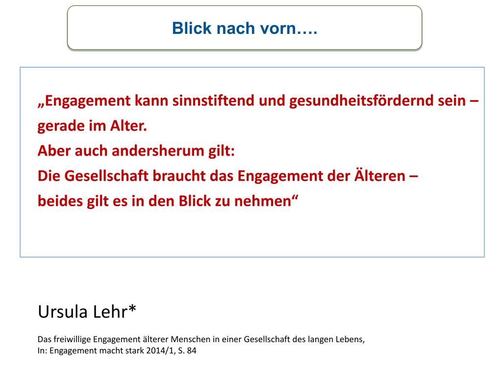 Blick nach vorn…. „Engagement kann sinnstiftend und gesundheitsfördernd sein – gerade im Alter. Aber auch andersherum gilt: Die Gesellschaft braucht das Engagement der Älteren – beides gilt es in den Blick zu nehmen“ Ursula Lehr* Das freiwillige Engagement älterer Menschen in einer Gesellschaft des langen Lebens, In: Engagement macht stark 2014/1, S. 84
