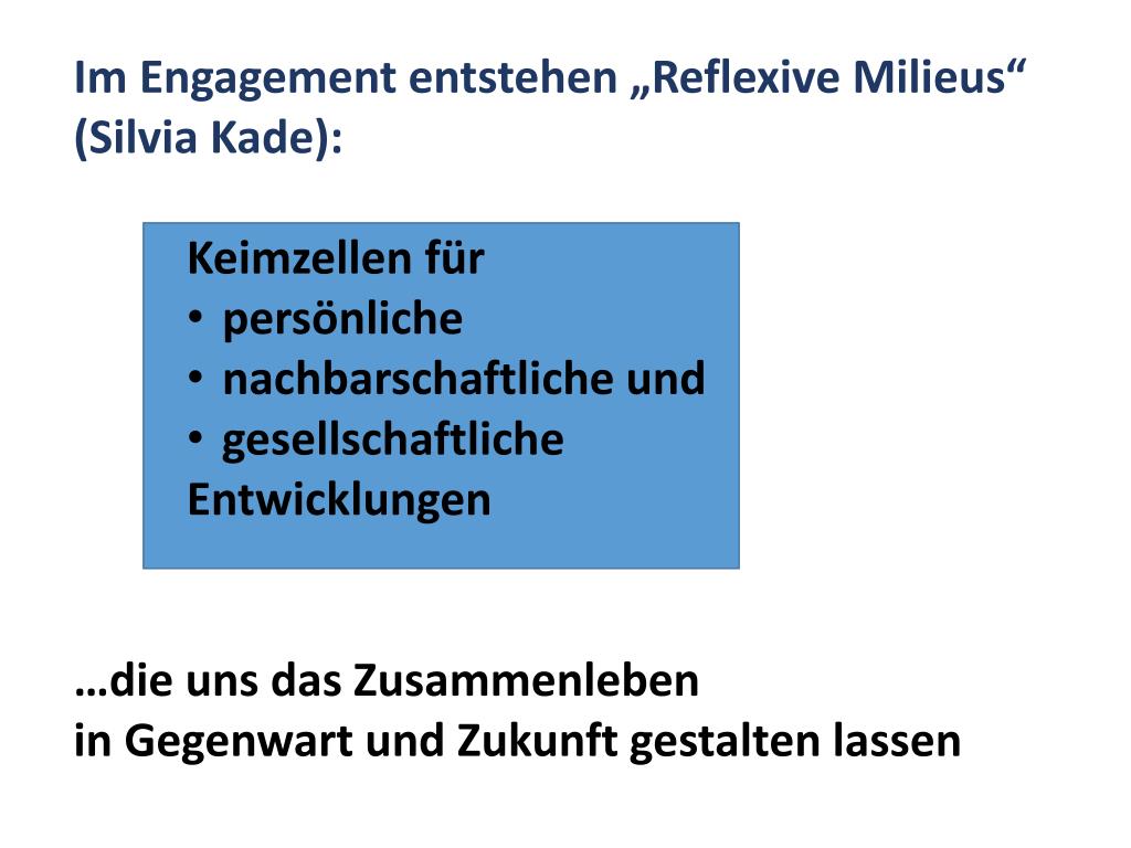 Im Engagement entstehen „Reflexive Milieus“ • (Silvia Kade): • Keimzellen für • persönliche • nachbarschaftliche und • gesellschaftliche • Entwicklungen • …die uns das Zusammenleben • in Gegenwart und Zukunft gestalten lassen