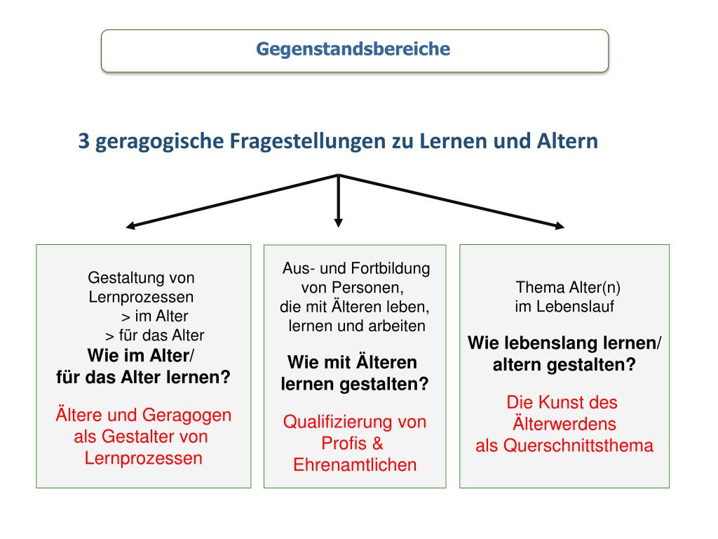 Gegenstandsbereiche 3 geragogische Fragestellungen zu Lernen und Altern Gestaltung von Lernprozessen > im Alter > für das Alter Wie im Alter/ für das Alter lernen? Ältere und Geragogen als Gestalter von Lernprozessen Thema Alter(n) im Lebenslauf Wie lebenslang lernen/ altern gestalten? Die Kunst des Älterwerdens als Querschnittsthema Aus- und Fortbildung von Personen, die mit Älteren leben, lernen und arbeiten Wie mit Älteren lernen gestalten? Qualifizierung von Profis & Ehrenamtlichen