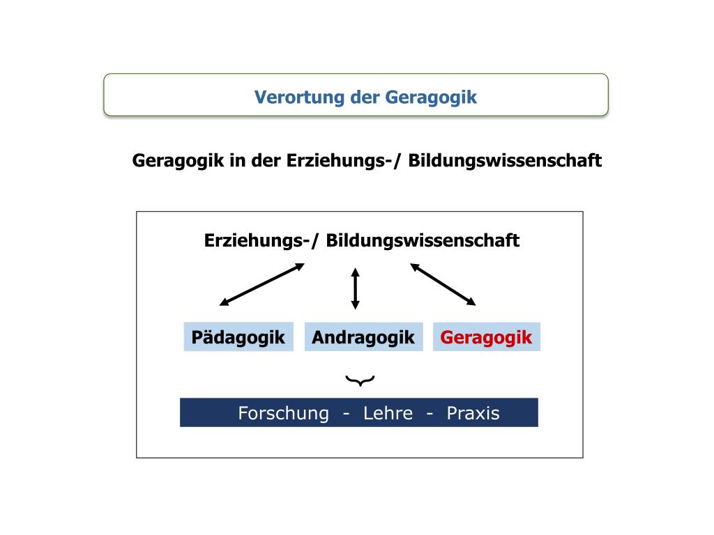 Verortung der Geragogik Geragogik in der Erziehungs-/ Bildungswissenschaft Erziehungs-/ Bildungswissenschaft Andragogik Geragogik Pädagogik Forschung - Lehre - Praxis