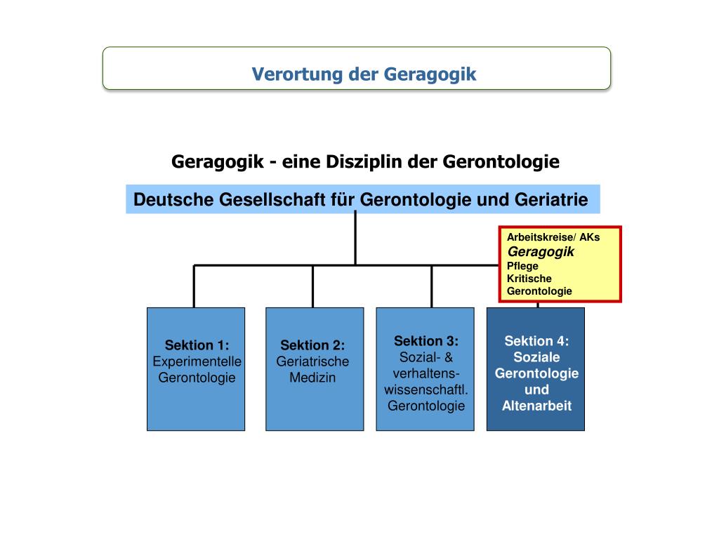 Verortung der Geragogik Geragogik - eine Disziplin der Gerontologie Deutsche Gesellschaft für Gerontologie und Geriatrie Arbeitskreise/ AKs Geragogik Pflege Kritische Gerontologie Sektion 3: Sozial- & verhaltens- wissenschaftl. Gerontologie Sektion 4: Soziale Gerontologie und Altenarbeit Sektion 1: Experimentelle Gerontologie Sektion 2: Geriatrische Medizin