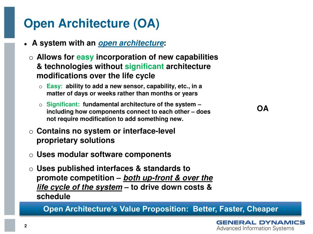 Open Architecture (OA) • A system with an open architecture: • Allows for easy incorporation of new capabilities & technologies without significant architecture modifications over the life cycle • Easy: ability to add a new sensor, capability, etc., in a matter of days or weeks rather than months or years • Significant:fundamental architecture of the system – including how components connect to each other – does not require modification to add something new. • Contains no system or interface-level proprietary solutions • Uses modular software components • Uses published interfaces & standards to promote competition – both up-front & over the life cycle of the system – to drive down costs & schedule OA Open Architecture’s Value Proposition: Better, Faster, Cheaper