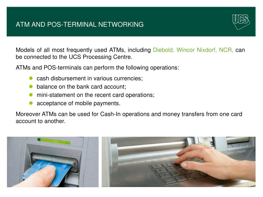 ATM AND POS-TERMINAL NETWORKING Models of all most frequently used ATMs, including Diebold, Wincor Nixdorf, NCR, can be connected to the UCS Processing Centre. ATMs and POS-terminals can perform the following operations: Moreover ATMs can be used for Cash-In operations and money transfers from one card account to another. • cash disbursement in various currencies; • balance on the bank card account; • mini-statement on the recent card operations; • acceptance of mobile payments.