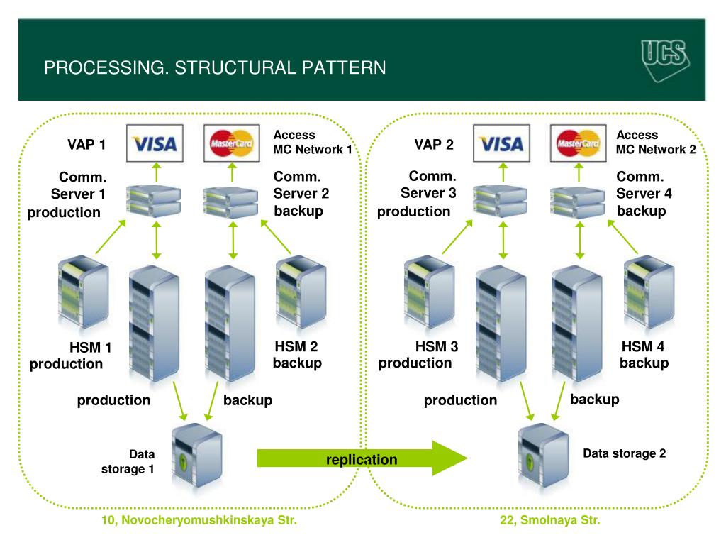 PROCESSING. STRUCTURAL PATTERN Access MC Network 1 Access MC Network 2 VAP 1 VAP 2 Сomm.Server 3 Сomm. Server 2 Сomm. Server 4 Сomm.Server 1 backup backup production production HSM 2 HSM 3 HSM 4 HSM 1 backup production backup production backup production backup production Data storage 2 Datastorage 1 replication 23 10, Novocheryomushkinskaya Str. 22, Smolnaya Str.