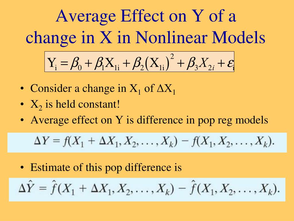 Average Effect on Y of a change in X in Nonlinear Models • Consider a change in X1 of ΔX1 • X2 is held constant! • Average effect on Y is difference in pop reg models • Estimate of this pop difference is