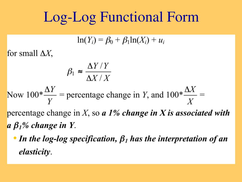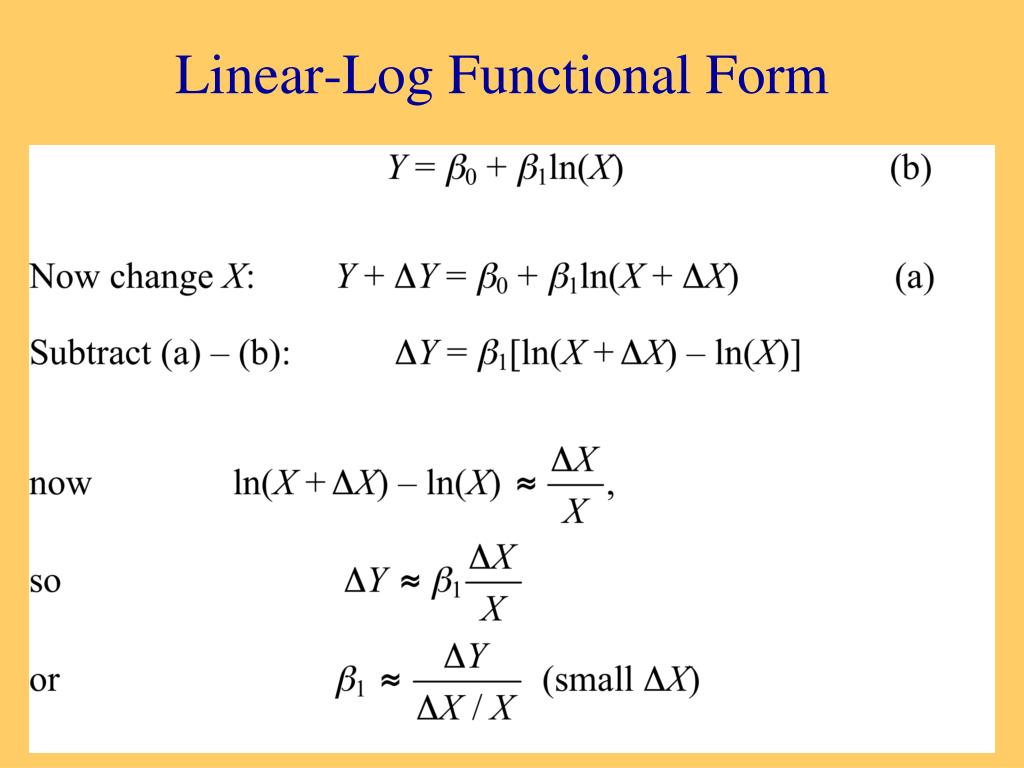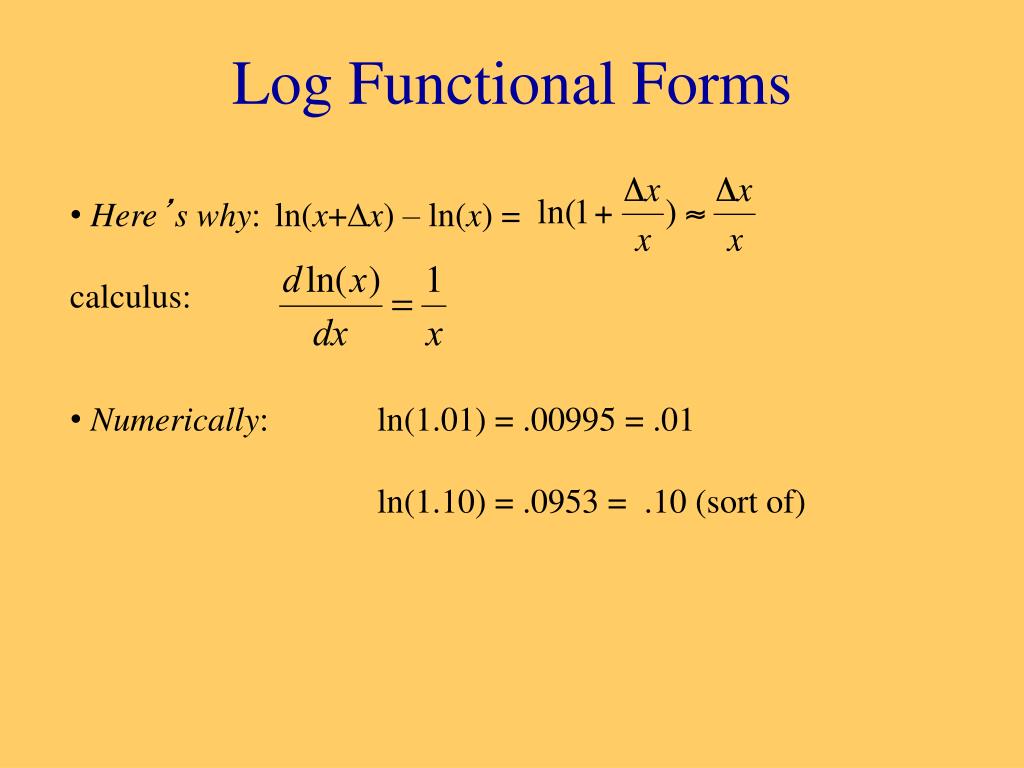 Log Functional Forms • Here’s why: ln(x+x) – ln(x) = • calculus: • Numerically: ln(1.01) = .00995 = .01 • ln(1.10) = .0953 = .10 (sort of)