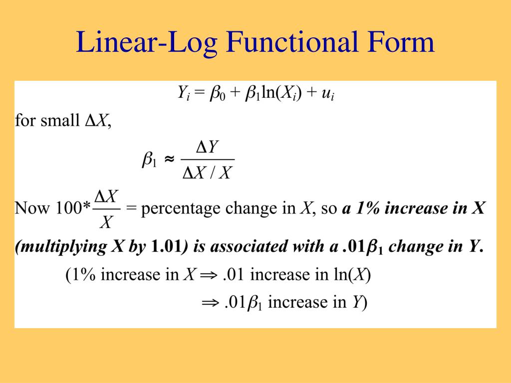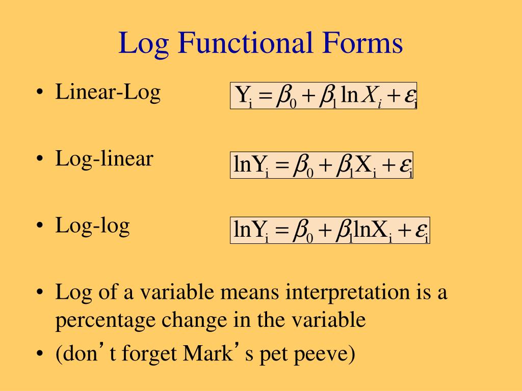 Log Functional Forms • Linear-Log • Log-linear • Log-log • Log of a variable means interpretation is a percentage change in the variable • (don’t forget Mark’s pet peeve)