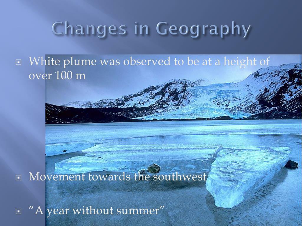 Changes in Geography • White plume was observed to be at a height of over 100 m • Movement towards the southwest • “A year without summer”