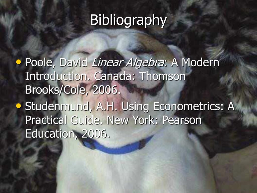 Bibliography • Poole, David Linear Algebra: A Modern Introduction. Canada: Thomson Brooks/Cole, 2006. • Studenmund, A.H. Using Econometrics: A Practical Guide. New York: Pearson Education, 2006.