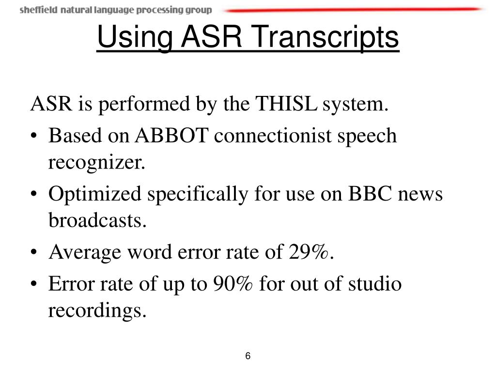 ASR is performed by the THISL system. Based on ABBOT connectionist speech recognizer. Optimized specifically for use on BBC news broadcasts. Average word error rate of 29%. Error rate of up to 90% for out of studio recordings. Using ASR Transcripts 6