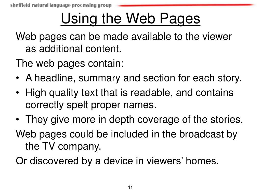 Web pages can be made available to the viewer as additional content. The web pages contain: A headline, summary and section for each story. High quality text that is readable, and contains correctly spelt proper names. They give more in depth coverage of the stories. Web pages could be included in the broadcast by the TV company. Or discovered by a device in viewers’ homes. Using the Web Pages 11