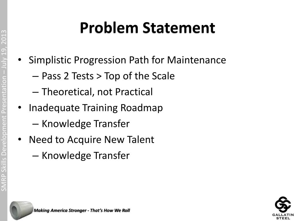 Problem Statement • Simplistic Progression Path for Maintenance • Pass 2 Tests > Top of the Scale • Theoretical, not Practical • Inadequate Training Roadmap • Knowledge Transfer • Need to Acquire New Talent • Knowledge Transfer Making America Stronger - That’s How We Roll