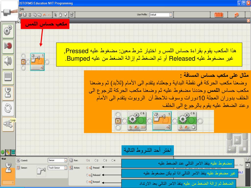 مكعب حساس اللمس هذا المكعب يقوم بقراءة حساس اللمس و اختيار شرط معين: مضغوط عليه Pressed, غير مضغوط عليه Released أو تم الضغط ثم إزالة الضغط من عليه Bumped. مثال على مكعب حساس المسافة: وضعنا مكعب الحركة في نقطة البداية وجعلناه يتقدم الى الأمام (للأبد) ثم وضعنا مكعب حساس اللمس وحددنا مضغوط عليه ثم وضعنا مكعب الحركة للرجوع الى الخلف بدوران العجلة 10دورات وسوف نلاحظ أن الروبوت يتقدم الى الأمام وعند الضغط عليه يقوم بالرجوع الى الخلف اختر أحد الشروط التالية مضغوط عليهينفذ الامر التالي عند الضغط عليه غير مضغوط عليهينفذ الامر التالي اذا لم يكن مضغوط عليه الضغط ثم إزالة الضغط من عليه ينفذ الامر التالي بعد الارتداد