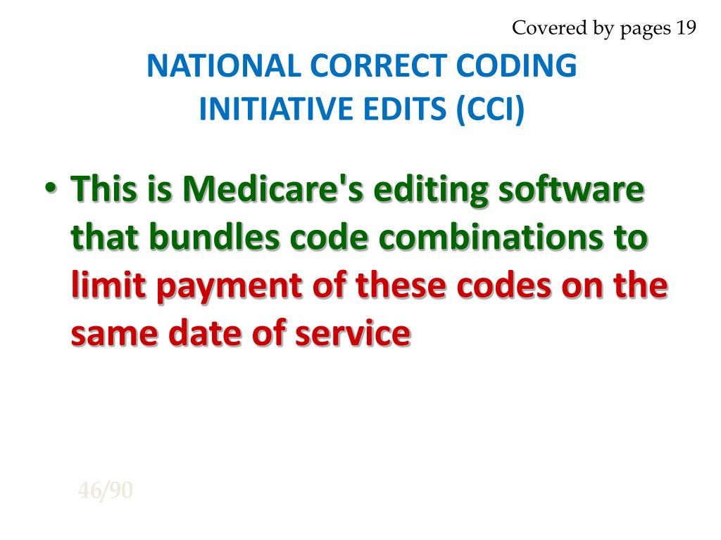 Covered by pages 19 NATIONAL CORRECT CODING INITIATIVE EDITS (CCI) • This is Medicare's editing software that bundles code combinations to limit payment of these codes on the same date of service 46/90