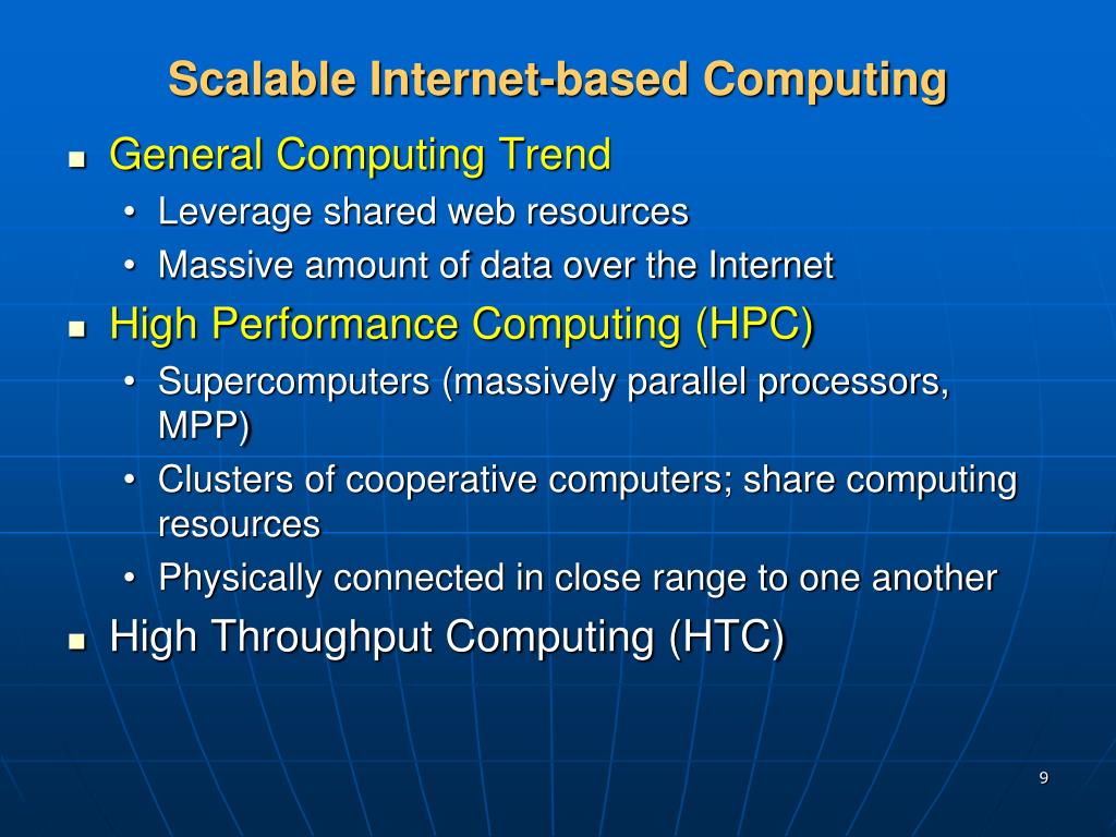 Scalable Internet-based Computing • General Computing Trend • Leverage shared web resources • Massive amount of data over the Internet • High Performance Computing (HPC) • Supercomputers (massively parallel processors, MPP) • Clusters of cooperative computers; share computing resources • Physically connected in close range to one another • High Throughput Computing (HTC)