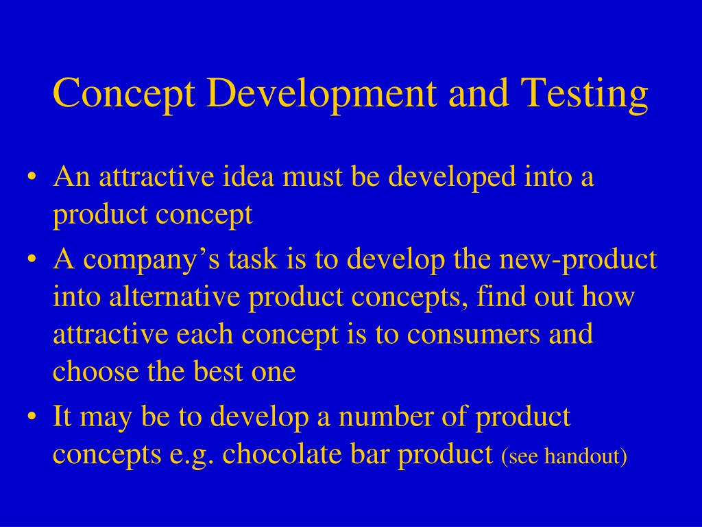 Concept Development and Testing • An attractive idea must be developed into a product concept • A company’s task is to develop the new-product into alternative product concepts, find out how attractive each concept is to consumers and choose the best one • It may be to develop a number of product concepts e.g. chocolate bar product (see handout)