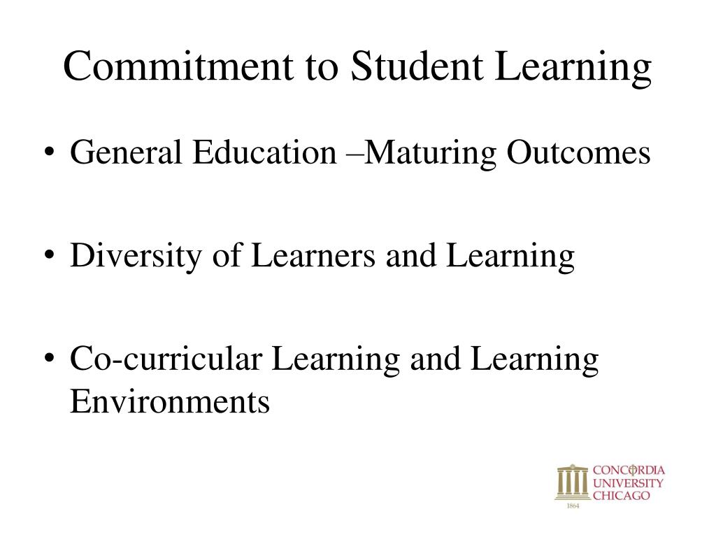 Commitment to Student Learning • General Education –Maturing Outcomes • Diversity of Learners and Learning • Co-curricular Learning and Learning Environments