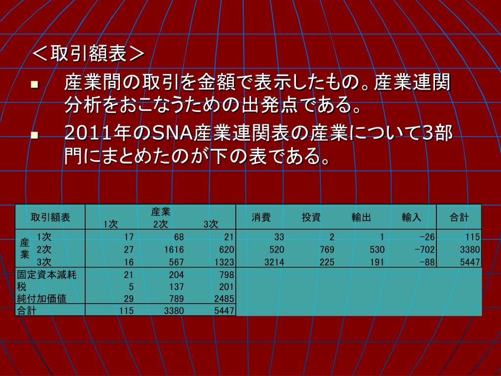 <逆行列表> • 生産波及効果を合計していったものは、逆行列表の形で表される。逆行列表の考え方をあらわすために、取引額表を下のように単純化する。 このモデルにおいて、行の需給バランスは次のようになる。