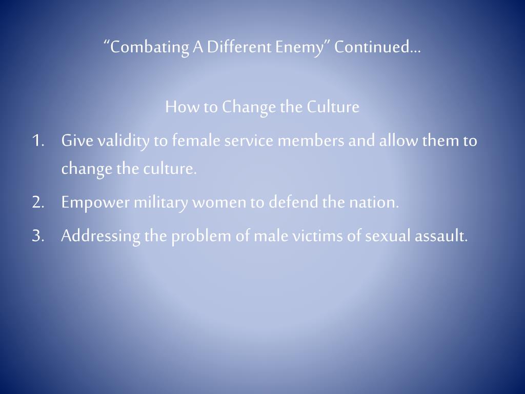 “Combating A Different Enemy” Continued… How to Change the Culture • Give validity to female service members and allow them to change the culture. • Empower military women to defend the nation. • Addressing the problem of male victims of sexual assault.