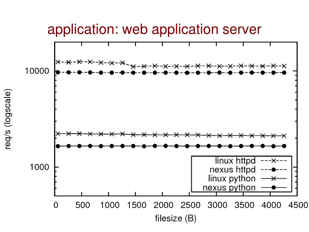 Protected Nexus calls incur overheads comparable to regular Linux calls but the microkernel architecture of the Nexus can necessitate additional and costly process boundary crossings Microbenchmarks