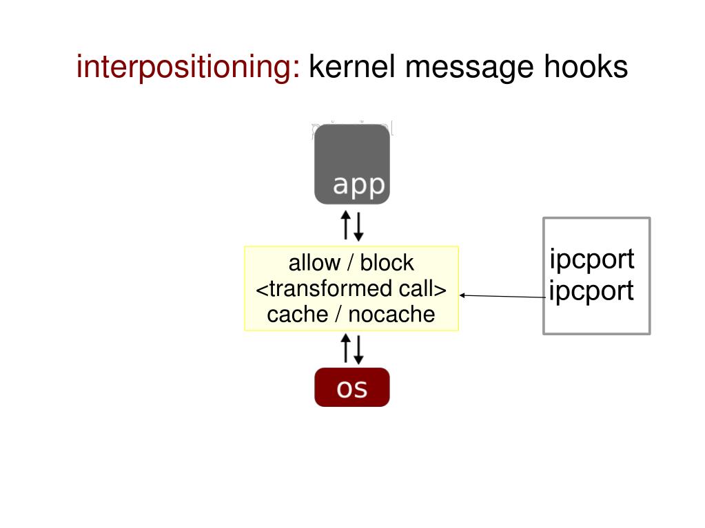 synthesis: (subject, operation, *) → ipcport authorization: (*, operation, object) → ipcport allow / block <transformed call> cache / nocache interpositioning: kernel message hooks