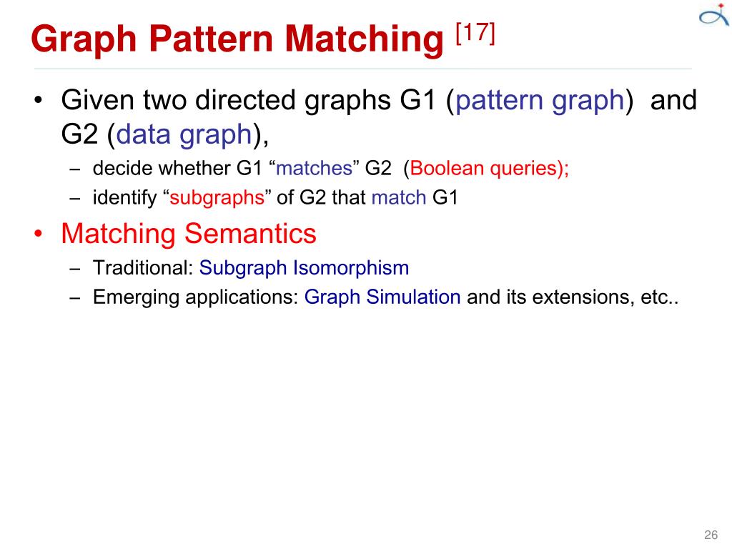 Graph Pattern Matching [17] • Given two directed graphs G1 (pattern graph) and G2 (data graph), • decide whether G1 “matches” G2 (Boolean queries); • identify “subgraphs” of G2 that match G1 • Matching Semantics • Traditional: Subgraph Isomorphism • Emerging applications: Graph Simulation and its extensions, etc..