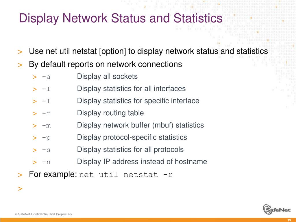 Display Network Status and Statistics • Use net utilnetstat [option] to display network status and statistics • By default reports on network connections • -a Display all sockets • -I Display statistics for all interfaces • -I Display statistics for specific interface • -r Display routing table • -m Display network buffer (mbuf) statistics • -p Display protocol-specific statistics • -s Display statistics for all protocols • -n Display IP address instead of hostname • For example: net utilnetstat -r