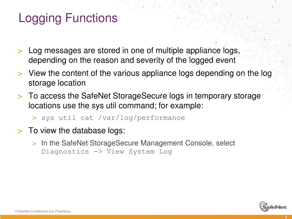 Logging Functions • Log messages are stored in one of multiple appliance logs, depending on the reason and severity of the logged event • View the content of the various appliance logs depending on the log storage location • To access the SafeNet StorageSecure logs in temporary storage locations use the sys util command; for example: • sys util cat /var/log/performance • To view the database logs: • In the SafeNet StorageSecure Management Console, select Diagnostics -> View System Log