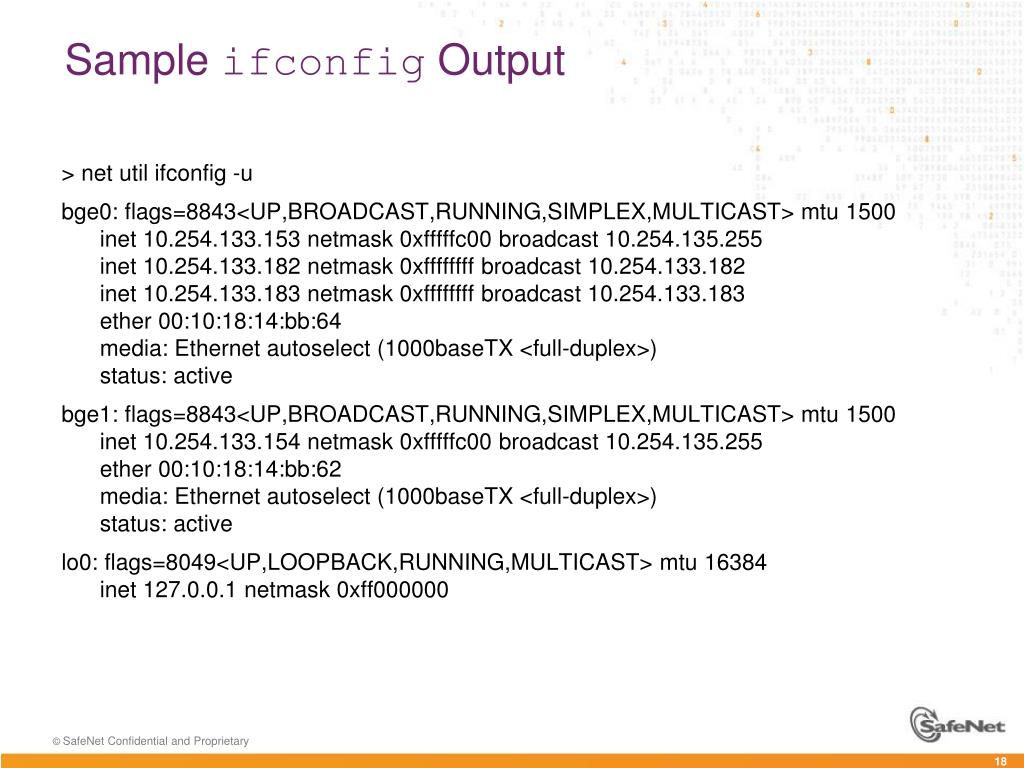 Sample ifconfig Output > net utilifconfig -u bge0: flags=8843<UP,BROADCAST,RUNNING,SIMPLEX,MULTICAST> mtu 1500inet 10.254.133.153 netmask 0xfffffc00 broadcast 10.254.135.255 inet 10.254.133.182 netmask 0xffffffff broadcast 10.254.133.182 inet 10.254.133.183 netmask 0xffffffff broadcast 10.254.133.183 ether 00:10:18:14:bb:64 media: Ethernet autoselect (1000baseTX <full-duplex>)status: active bge1: flags=8843<UP,BROADCAST,RUNNING,SIMPLEX,MULTICAST> mtu 1500 inet 10.254.133.154 netmask 0xfffffc00 broadcast 10.254.135.255 ether 00:10:18:14:bb:62 media: Ethernet autoselect (1000baseTX <full-duplex>) status: active lo0: flags=8049<UP,LOOPBACK,RUNNING,MULTICAST> mtu 16384 inet 127.0.0.1 netmask 0xff000000