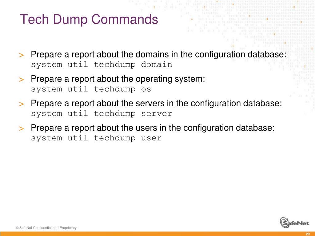 Tech Dump Commands • Prepare a report about the domains in the configuration database:system utiltechdump domain • Prepare a report about the operating system: system utiltechdumpos • Prepare a report about the servers in the configuration database: system utiltechdump server • Prepare a report about the users in the configuration database: system utiltechdump user
