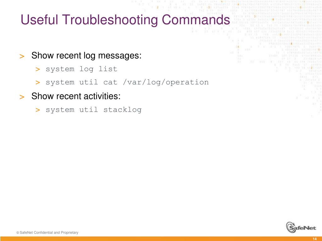 Useful Troubleshooting Commands • Show recent log messages: • system log list • system util cat /var/log/operation • Show recent activities: • system utilstacklog