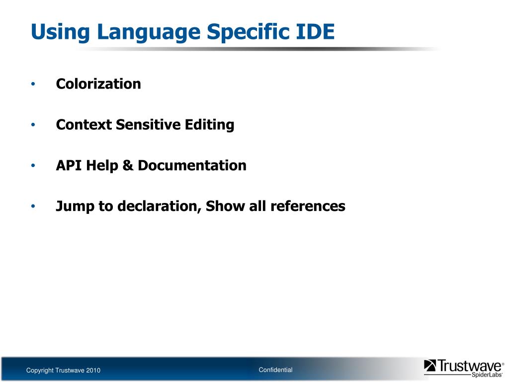 Using Language Specific IDE • Colorization • Context Sensitive Editing • API Help & Documentation • Jump to declaration, Show all references