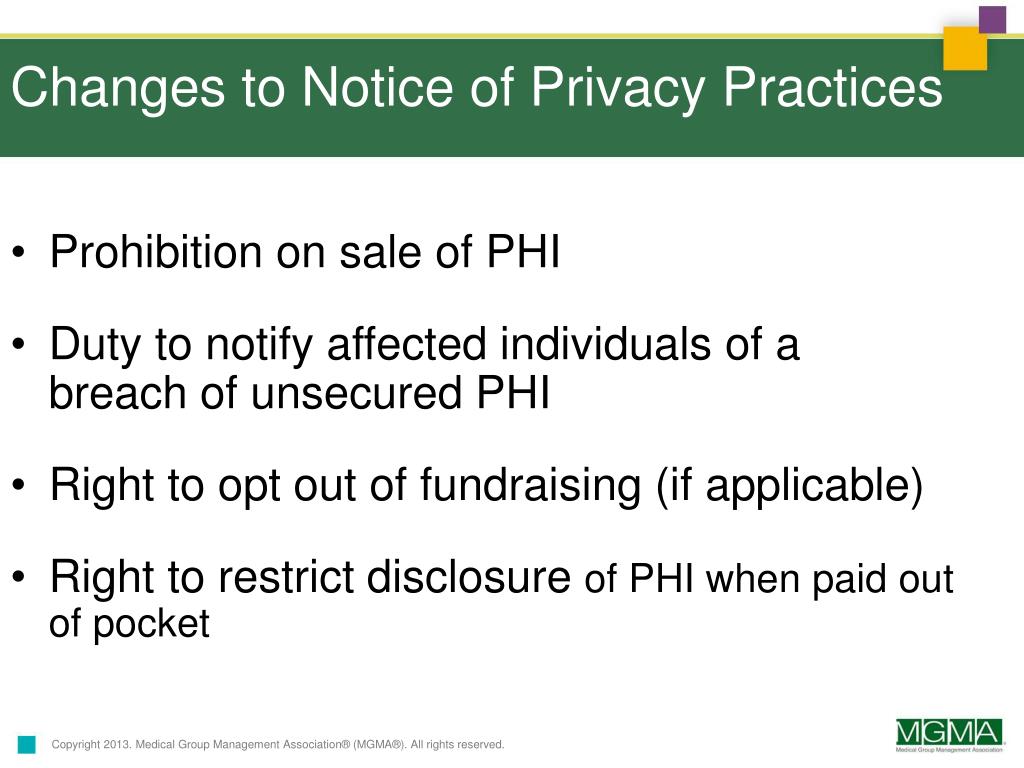Changes to Notice of Privacy Practices • Prohibition on sale of PHI • Duty to notify affected individuals of a breach of unsecured PHI • Right to opt out of fundraising (if applicable) • Right to restrict disclosure of PHI when paid out of pocket