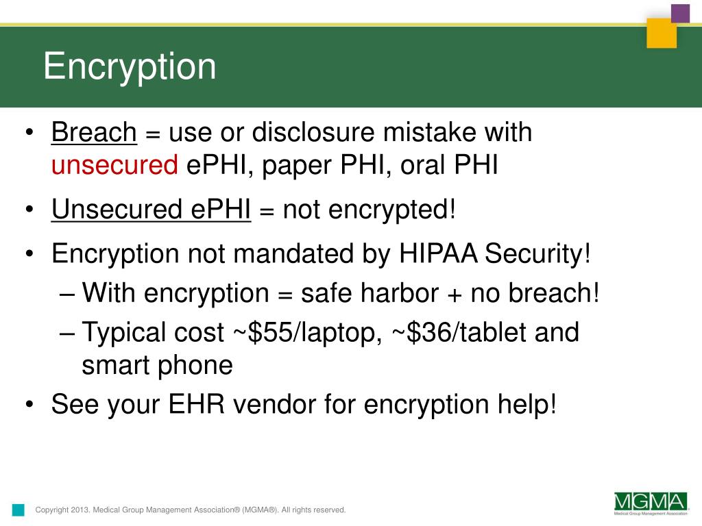 Encryption • Breach = use or disclosure mistake with unsecured ePHI, paper PHI, oral PHI • Unsecured ePHI = not encrypted! • Encryption not mandated by HIPAA Security! • With encryption = safe harbor + no breach! • Typical cost ~$55/laptop, ~$36/tablet and smart phone • See your EHR vendor for encryption help!