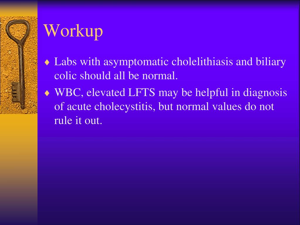 Workup • Labs with asymptomatic cholelithiasis and biliary colic should all be normal. • WBC, elevated LFTS may be helpful in diagnosis of acute cholecystitis, but normal values do not rule it out.
