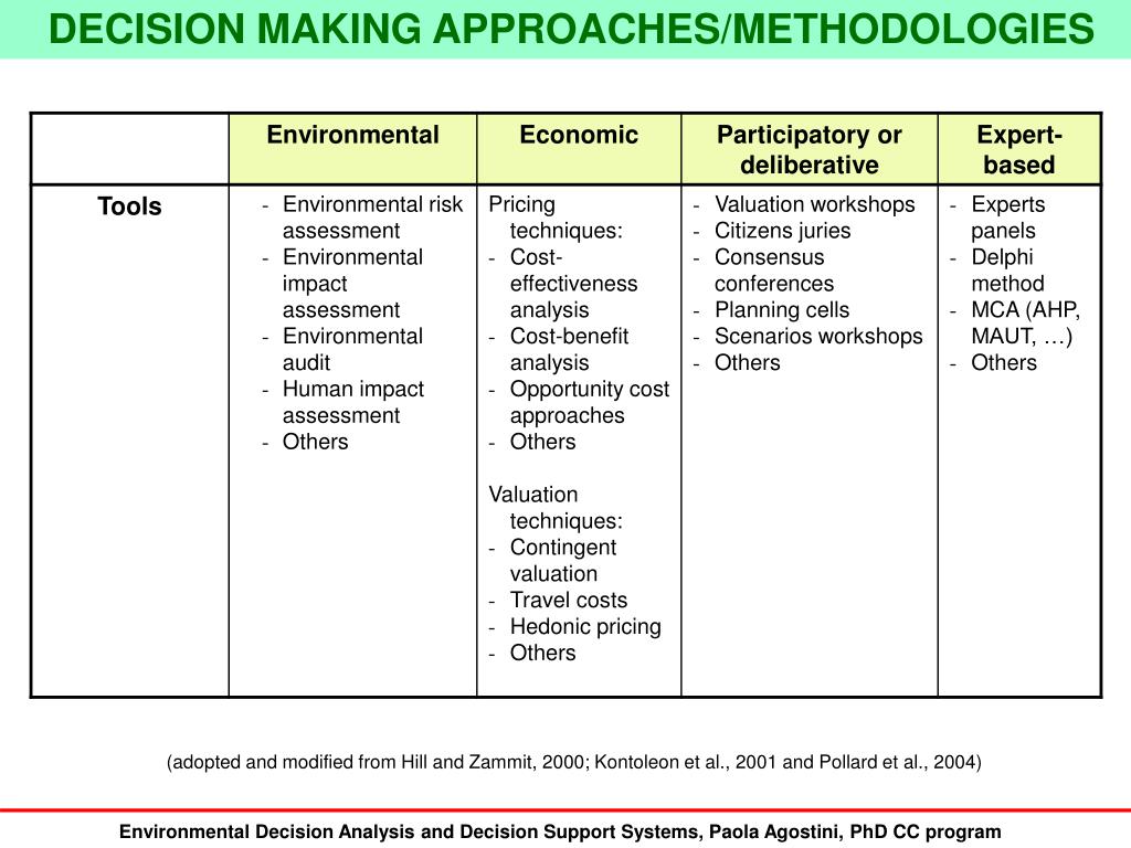 DECISION MAKING APPROACHES/METHODOLOGIES • Environmental methods: tools derived from the scientific disciplines of ecology, environmental sciences, toxicology and similar • Economic methods: pricing techniques, such as cost- benefit analysis or opportunity costs analysis, and valuation techniques, based on revealed preferences (adopted and modified from Hill and Zammit, 2000; Kontoleon et al., 2001 and Pollard et al., 2004)
