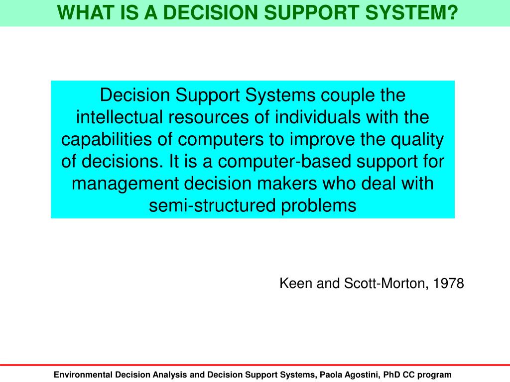 WHAT IS A DECISION SUPPORT SYSTEM? Decision Support Systems couple the intellectual resources of individuals with the capabilities of computers to improve the quality of decisions. It is a computer-based support for management decision makers who deal with semi-structured problems Keen and Scott-Morton, 1978
