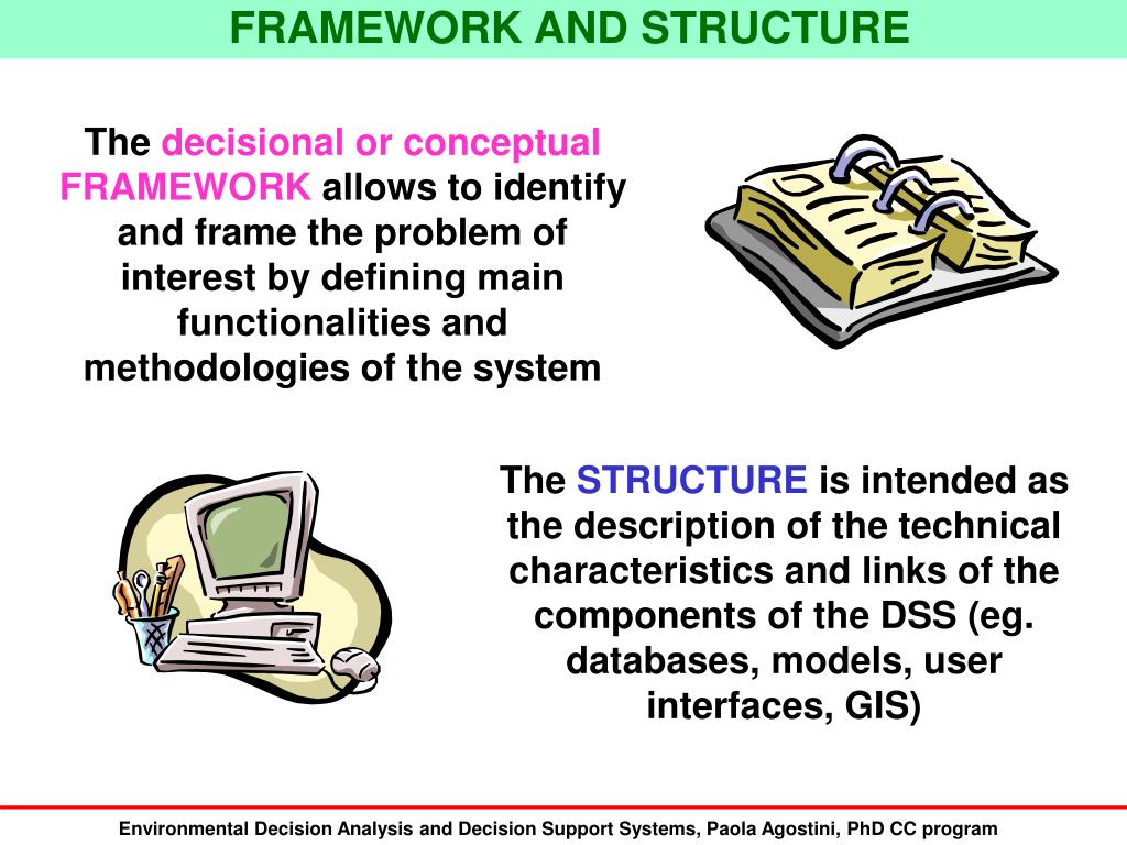 FRAMEWORK AND STRUCTURE The decisional or conceptual FRAMEWORK allows to identify and frame the problem of interest by defining main functionalities and methodologies of the system The STRUCTUREis intended as the description of the technical characteristics and links of the components of the DSS (eg. databases, models, user interfaces, GIS)
