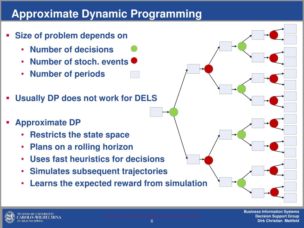 ApproximateDynamic Programming • Size of problem depends on • Number of decisions • Number of stoch. events • Number of periods • Usually DP does not work for DELS • Approximate DP • Restricts the state space • Plans on a rolling horizon • Uses fast heuristics for decisions • Simulates subsequent trajectories • Learns the expected reward from simulation
