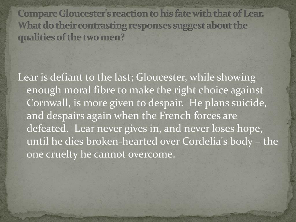 Compare Gloucester's reaction to his fate with that of Lear. What do their contrasting responses suggest about the qualities of the two men? Lear is defiant to the last; Gloucester, while showing enough moral fibre to make the right choice against Cornwall, is more given to despair. He plans suicide, and despairs again when the French forces are defeated. Lear never gives in, and never loses hope, until he dies broken-hearted over Cordelia's body – the one cruelty he cannot overcome.