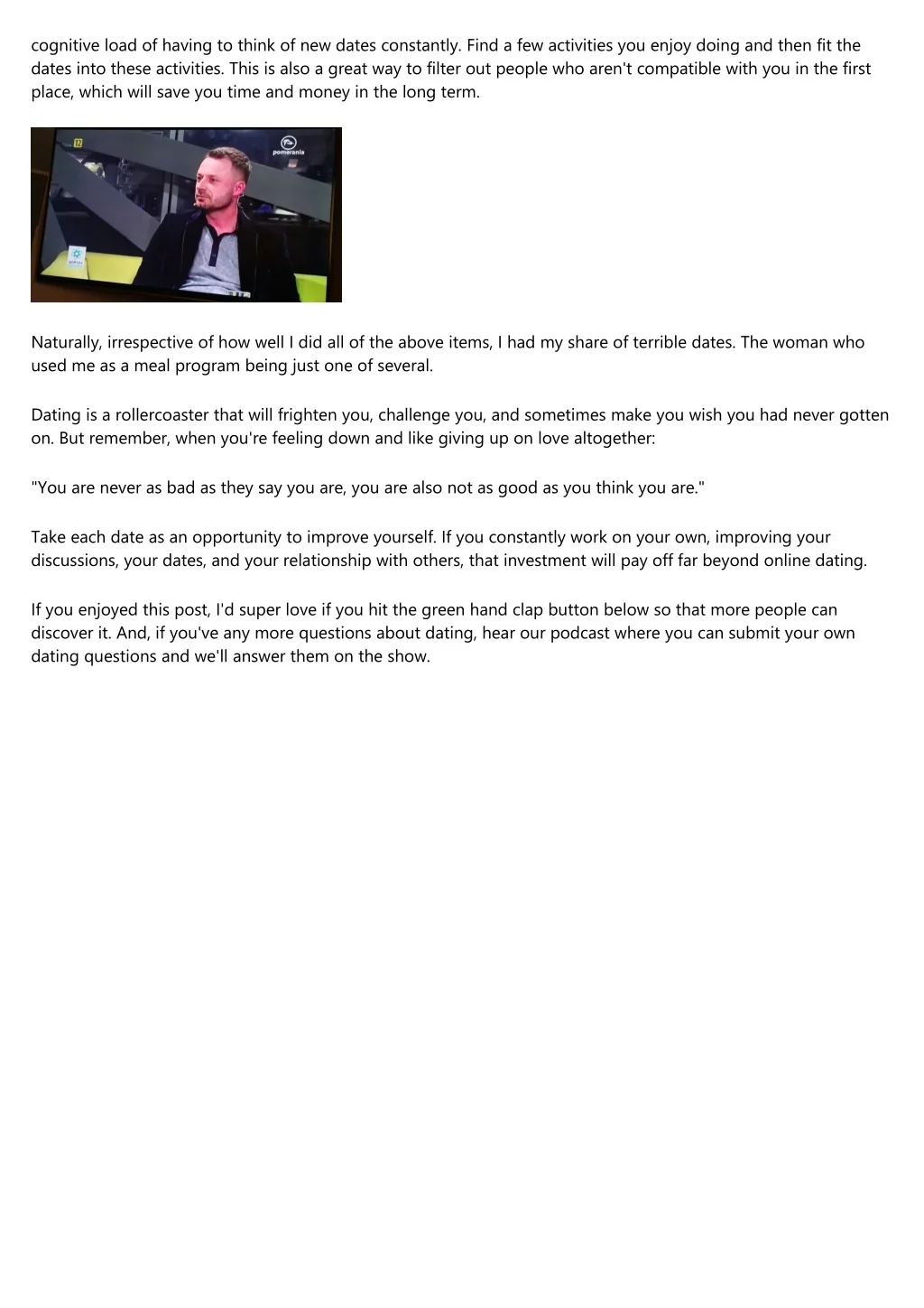 cognitive load of having to think of new dates constantly. Find a few activities you enjoy doing and then fit the dates into these activities. This is also a great way to filter out people who aren't compatible with you in the first place, which will save you time and money in the long term. Naturally, irrespective of how well I did all of the above items, I had my share of terrible dates. The woman who used me as a meal program being just one of several. Dating is a rollercoaster that will frighten you, challenge you, and sometimes make you wish you had never gotten on. But remember, when you're feeling down and like giving up on love altogether: "You are never as bad as they say you are, you are also not as good as you think you are." Take each date as an opportunity to improve yourself. If you constantly work on your own, improving your discussions, your dates, and your relationship with others, that investment will pay off far beyond online dating. If you enjoyed this post, I'd super love if you hit the green hand clap button below so that more people can discover it. And, if you've any more questions about dating, hear our podcast where you can submit your own dating questions and we'll answer them on the show.