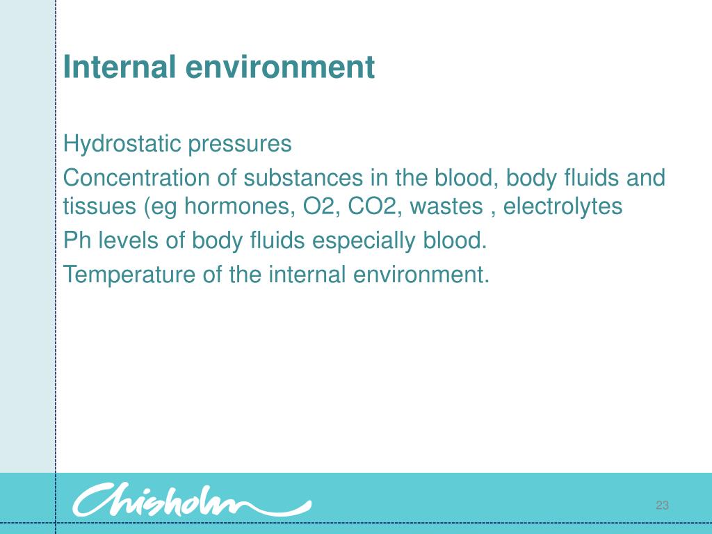 Internal environment • Hydrostatic pressures • Concentration of substances in the blood, body fluids and tissues (eg hormones, O2, CO2, wastes , electrolytes • Ph levels of body fluids especially blood. • Temperature of the internal environment.